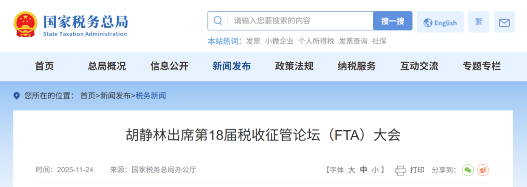 近日,中国国家税务总局局长胡静林率代表团应邀出席经济合作与发展组织(OECD)在南非开普敦举行的第18届税收征管论坛(FTA)大会并作主旨发言,系统介绍了中国税务部门在提升纳税意愿、增强征管效能方面的探索与实践,得到与会各方积极评价。